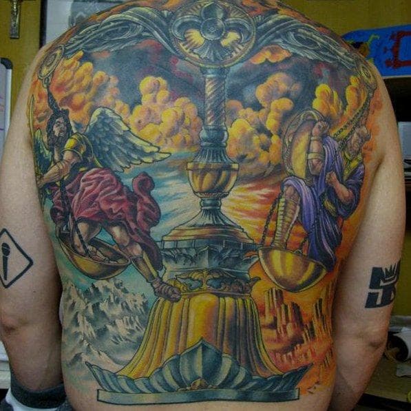 Angel back tattoo for men. The most striking features of angel tattoo designs are their wings. For men who want to have this type of angel tattoo, there are many possible designs. A figure of a curly haired angel woman is tattooed on the wearer's upper arm. The symbol is power over the enemy.
